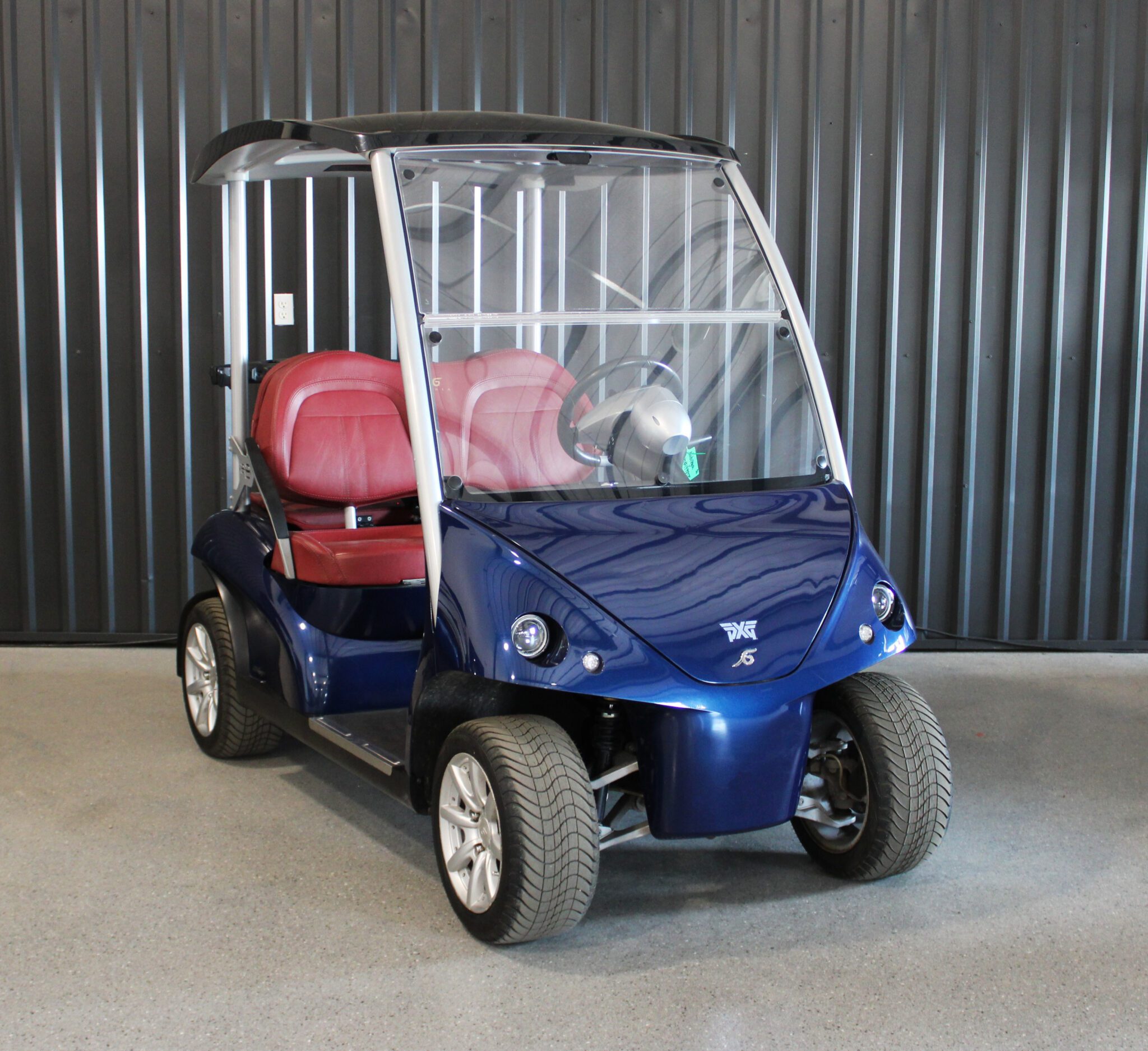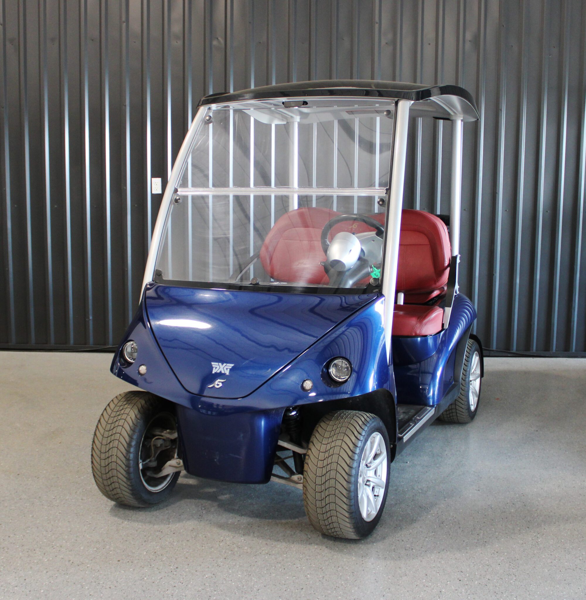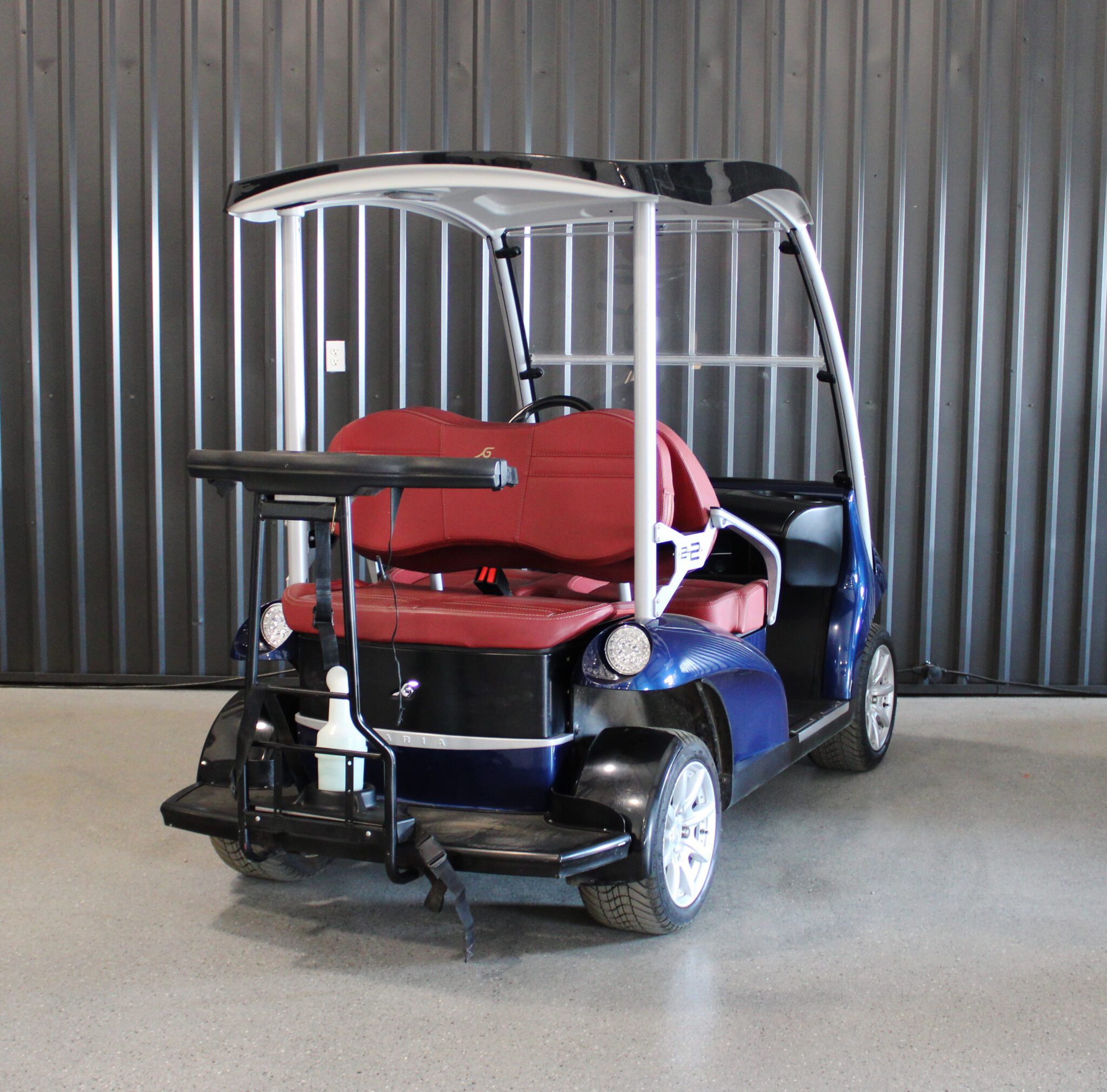 This 2017 Garia Via is finished in an eye-catching metallic dark blue and features vibrant red vinyl seats. Designed to carry four passengers in comfort, it seamlessly blends automotive styling with luxury golf cart functionality—perfect for resort fleets, upscale communities, or private estates.